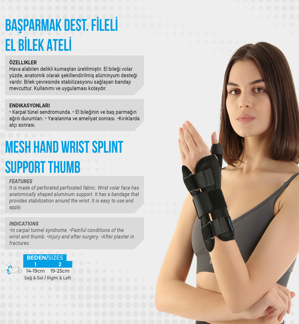 Hava alabilen delikli kumaştan üretilmiştir. El bileği volar yüzde, anatomik olarak şekillendirilmiş alüminyum desteği vardır. Bilek çevresinde stabilizasyonu sağlayan bandajı mevcuttur. Kullanımı ve uygulaması kolaydır.